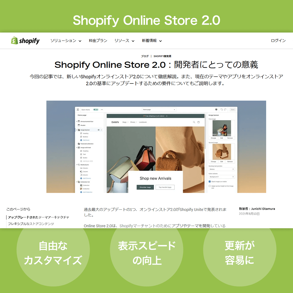 Shopifyが2021年8月から全世界にリリースしたOnline Store 2.0は、テーマ自体が改善されているため、サイトの表示スピードやユーザーエクスペリエンスが向上しています。またほぼ全てのページにセクション、ブロックが割り当てられ、簡単にカスタマイズできるようになりました。